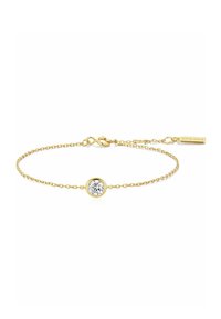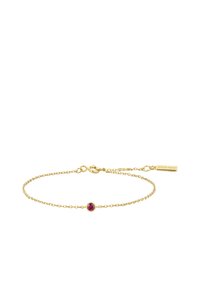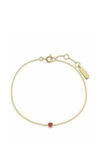 Poignet portant deux bracelets en or : une fine chaîne avec une petite pierre précieuse rouge et un bracelet à maillons plus épais.