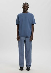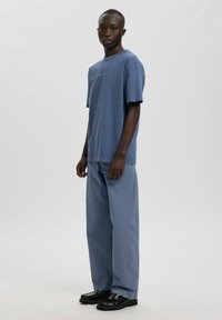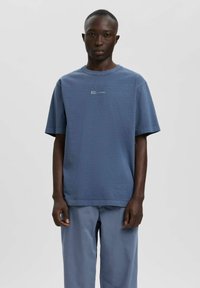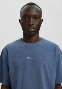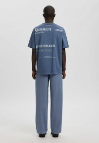 Personne à la peau foncée vue de dos, portant un t-shirt graphique bleu ANNARR et un pantalon bleu ample, sur un fond gris clair uni.