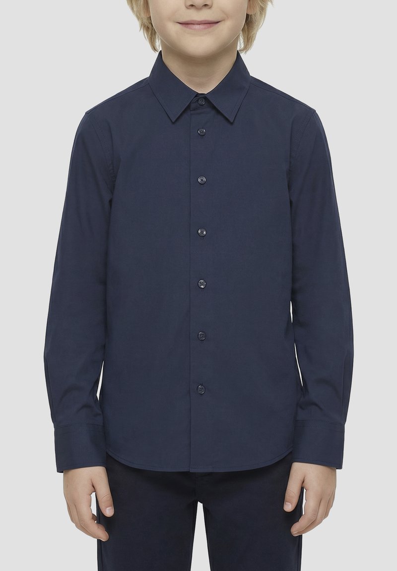 Enfant portant une chemise bleu marine à manches longues boutonnée, debout devant un fond clair uni, souriant légèrement.