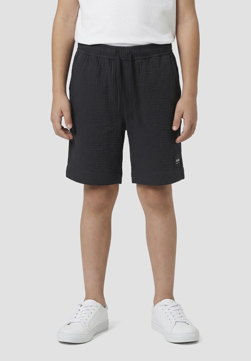 Enfant portant un short noir texturé à cordon, des baskets blanches et un t-shirt blanc, debout devant un fond gris uni.