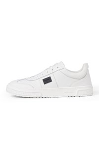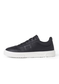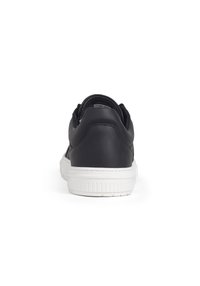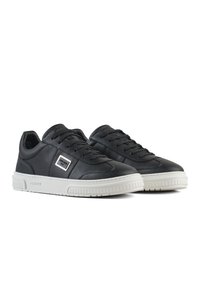 Baskets basses noires avec semelle blanche, design à lacets et petite plaque logo rectangulaire sur le côté.