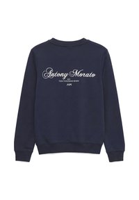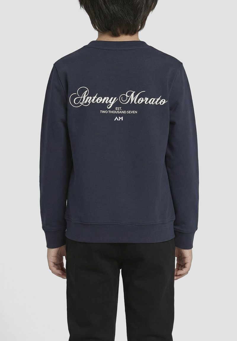 Enfant portant un sweat-shirt bleu marine avec le texte « Antony Morato Est. Two Thousand Seven AM » dans le dos, associé à un pantalon noir, de dos.