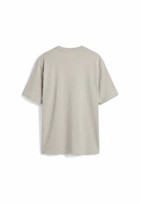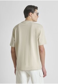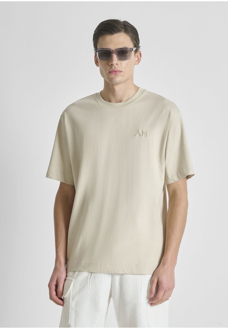 Jeune homme portant des lunettes de soleil gris translucides, un t-shirt beige surdimensionné et un pantalon blanc texturé, debout devant un fond clair uni.