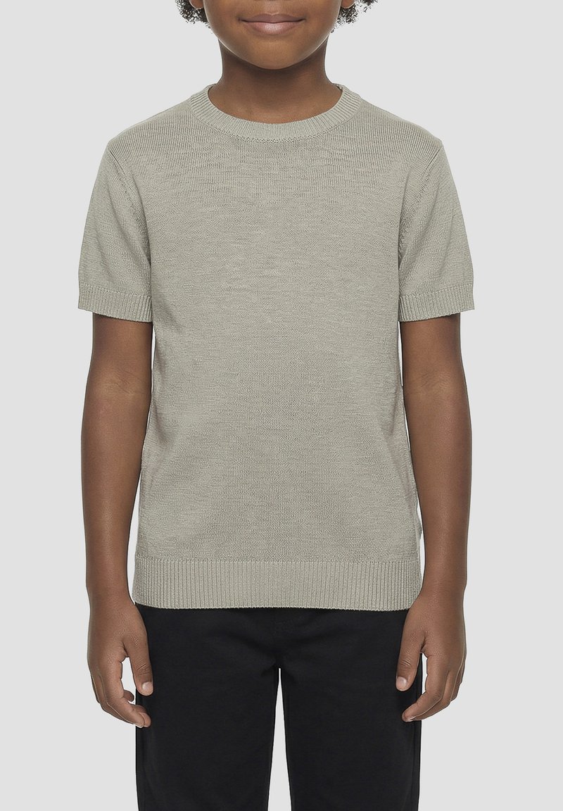 Enfant portant un pull en maille gris clair à manches courtes et un pantalon noir, debout devant un fond clair uni.