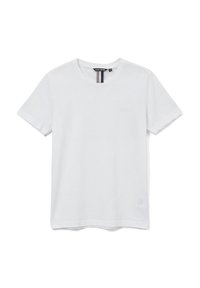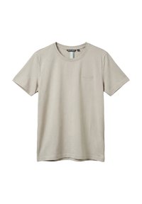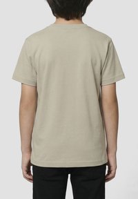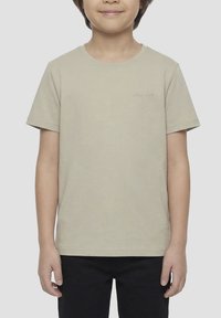 Enfant portant un t-shirt beige uni à manches courtes et un pantalon noir, debout les bras détendus devant un fond neutre.