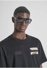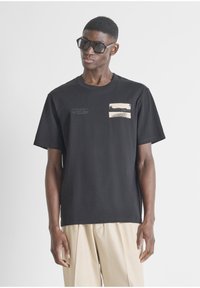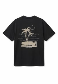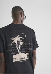 Homme portant un T-shirt noir avec un motif beige de palmier et de lune, accompagné de texte, et un pantalon beige, vu de dos sur un fond clair uni.