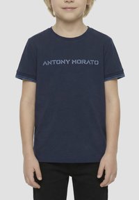 Enfant portant un t-shirt bleu marine avec le texte « ANTONY MORATO » sur la poitrine et un pantalon noir sur un fond gris clair.
