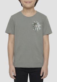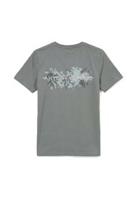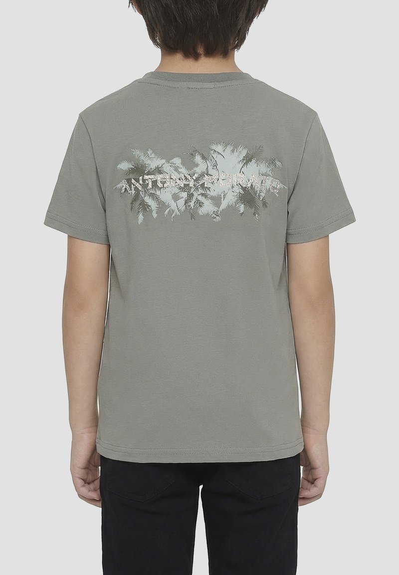 Enfant portant un t-shirt gris avec un motif de palmier délavé et un texte sur le haut du dos, associé à un pantalon noir, debout de dos.