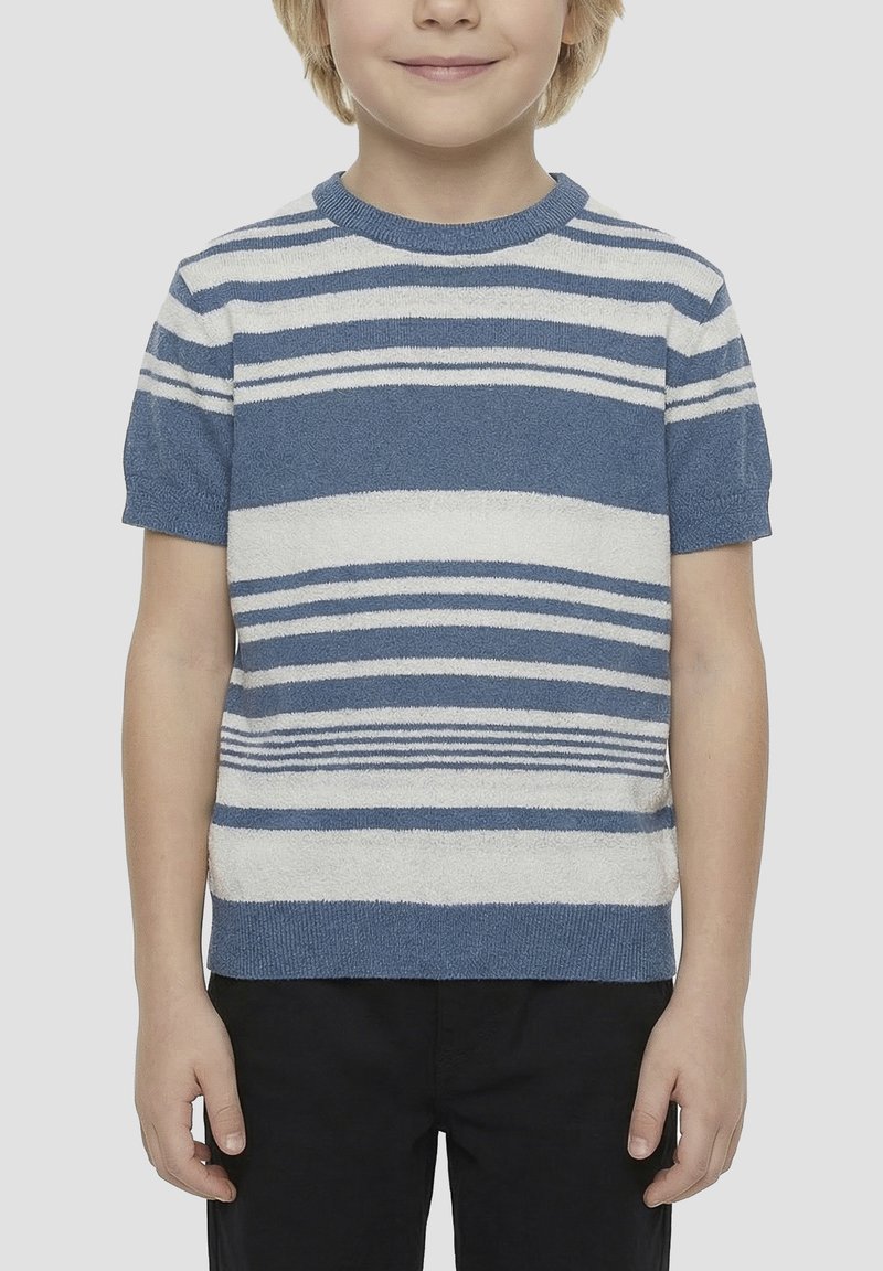 Enfant portant un pull en tricot à manches courtes rayé bleu et blanc et un pantalon noir, debout devant un fond clair uni.