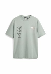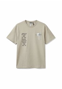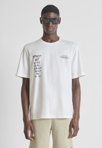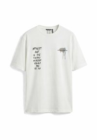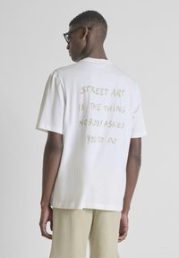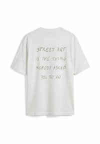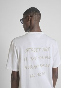 Homme portant des lunettes noires, un T-shirt blanc avec un texte beige "Street art is the thing nobody asked you to do," et un short beige texturé, de dos.