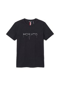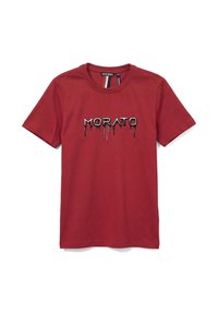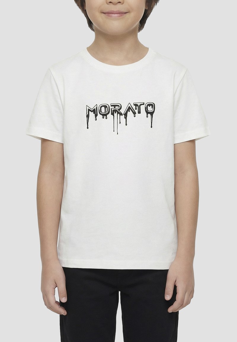 Enfant portant un t-shirt blanc à manches courtes avec un texte noir dégoulinant "MORATO" et un pantalon noir sur un fond gris uni.