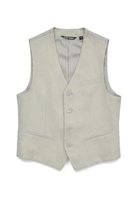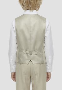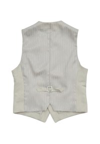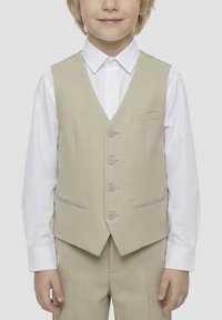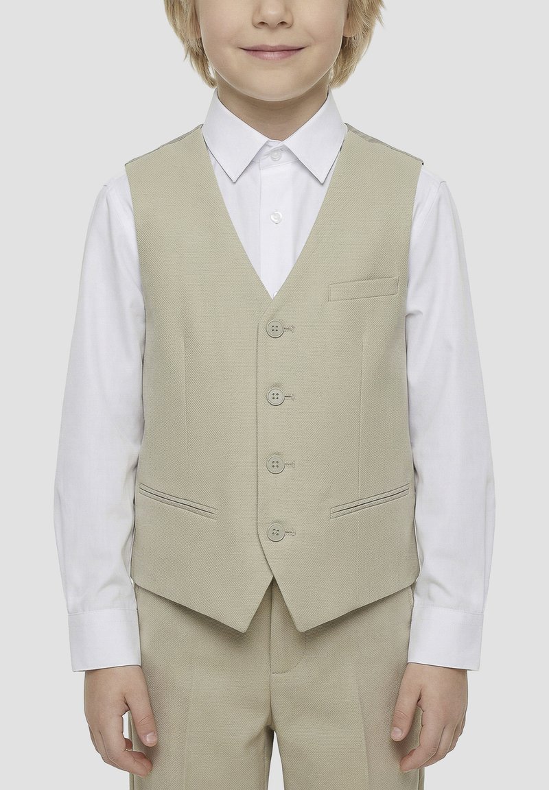 Jeune personne portant un gilet beige boutonné et un pantalon assorti sur une chemise blanche à col et manches longues, souriant subtilement.