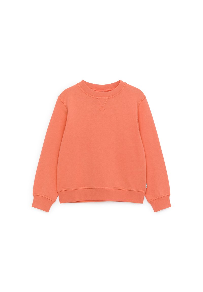 Sweat-shirt corail orange à col rond avec manches longues, poignets et taille côtelés, posé à plat sur un fond blanc.