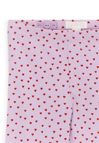 Leggings lilas avec un motif de petits cœurs rouges partout, longueur cheville, et une taille élastique ajustée.
