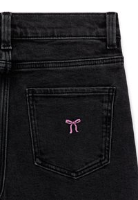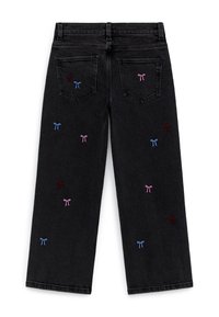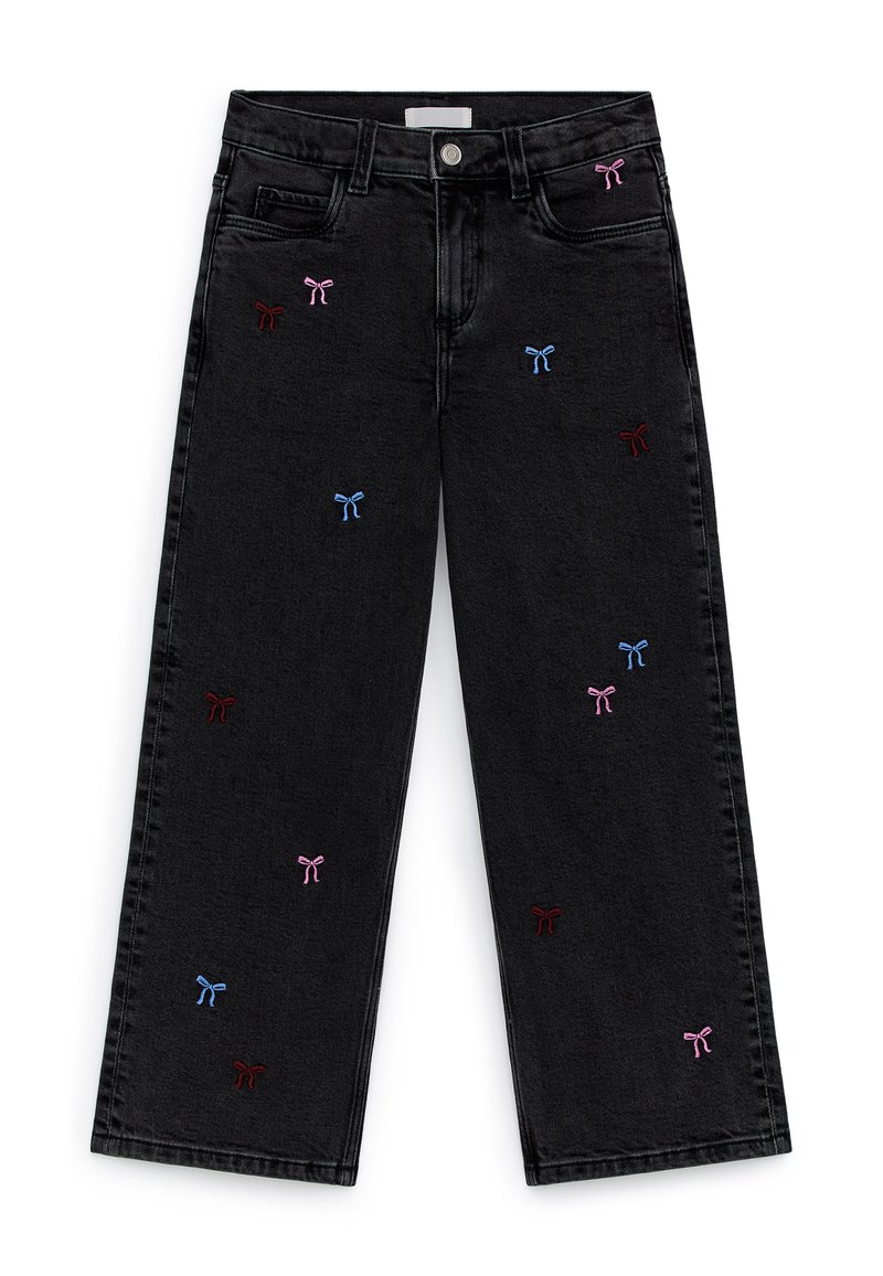 Jean noir à jambes larges avec broderies de nœuds roses, bleus et rouges dispersées sur le devant et design classique à cinq poches.