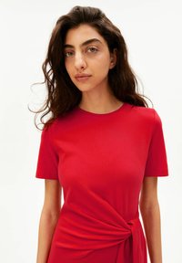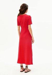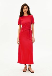 Femme aux cheveux longs et bouclés portant une robe midi rouge à manches courtes avec un lien sur le côté, debout contre un mur blanc et chaussée de sandales noires.