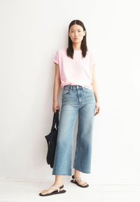 Jeune femme aux cheveux raides et foncés, portant un t-shirt rose clair et un jean bleu, debout avec une main sur la hanche sur fond blanc.