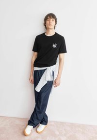 T-shirt en coton noir présentant un logo graphique "GET ON BIKE" sur le côté gauche de la poitrine et un col rond, associé à un pantalon plissé bleu foncé.