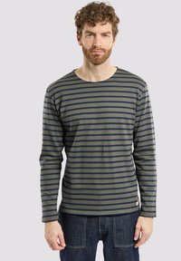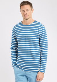 Chemise à manches longues marine avec des rayures horizontales bleu clair, encolure ronde et une petite étiquette logo en bas à gauche de l'ourlet. Tissu doux en mélange de coton.