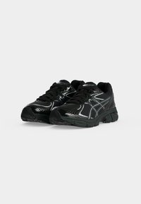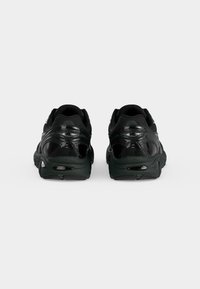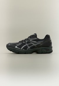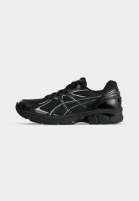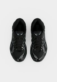 Baskets de sport noires avec des touches blanches et grises, semelle épaisse et rembourrée, et design à lacets, montrées en profil.