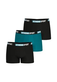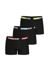 Boxer noirs avec une ceinture noire ornée de l'inscription "ATHENA SPORT" en lettres bleues et blanches, fabriqués dans un tissu lisse et extensible.