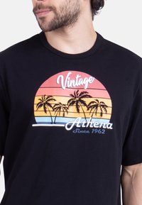 Homme aux cheveux bouclés portant un short noir et un T-shirt noir arborant un motif coloré de coucher de soleil et de palmier avec le texte "Vintage Athena".