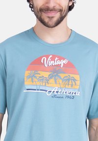 Homme aux cheveux bouclés portant un t-shirt bleu clair avec un motif vintage de coucher de soleil et de palmier, associé à un short noir, debout et souriant.