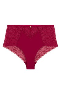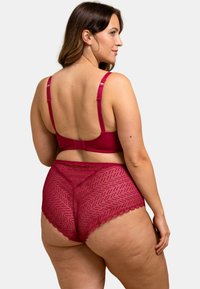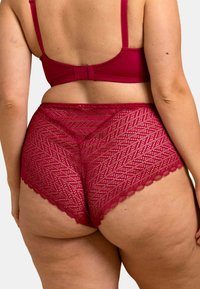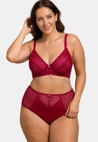 Ensemble bralette et culotte taille haute en dentelle bourgogne avec un motif en diamant, des bords festonnés et un accent décoratif en or.