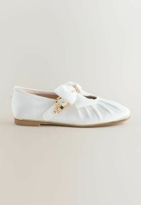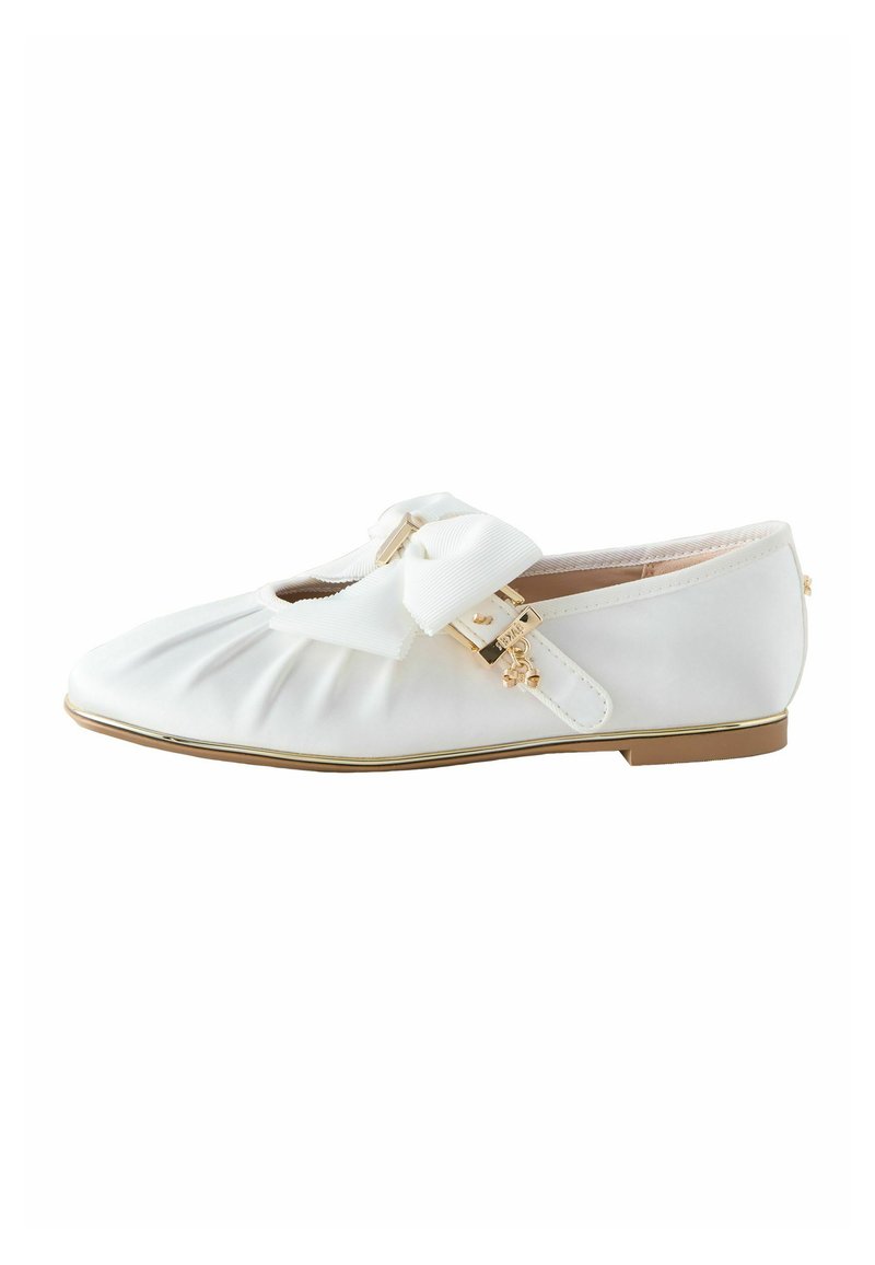 Chaussure plate blanche à bout rond, avec des plis, un grand nœud, des accents dorés et une semelle à profil bas. Matière lisse ressemblant à du satin.