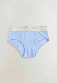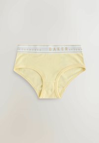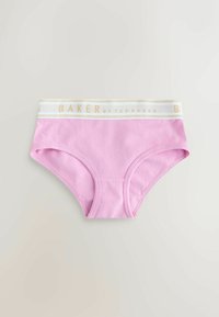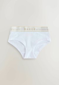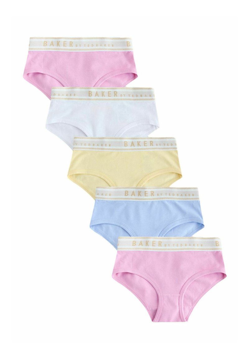 Cinq paires de culottes pour femmes en couleurs pastel rose, blanc, jaune, bleu et rose, chacune avec une ceinture blanche portant la mention "BAKER by TED BAKER."