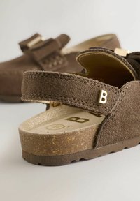 Sabot pour enfants en daim marron avec une bride réglable sur le dessus du pied et une bride ouverte au talon, avec des coutures détaillées et une semelle en liège.