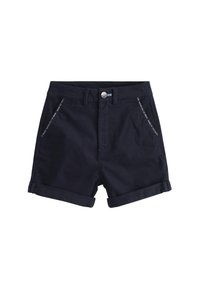 Shorts en coton bleu clair avec une fermeture à bouton, des revers roulés et des fermetures éclair accentues noires sur les poches avant. Texture lisse.