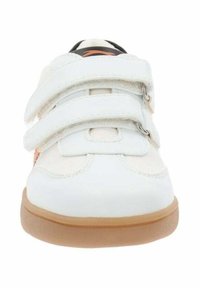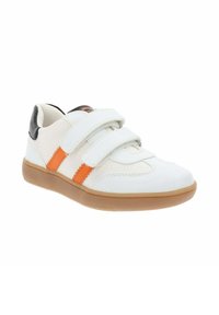 Baskets basses blanches avec des rayures latérales orange, deux bandes Velcro, un passant talon noir et une semelle en caoutchouc couleur gomme.