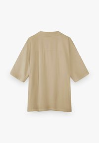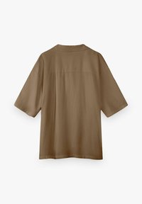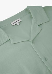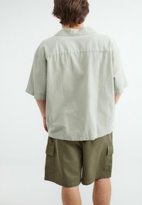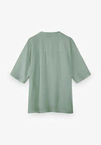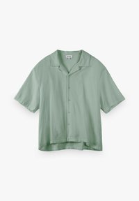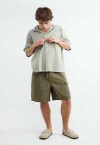 Jeune homme aux cheveux châtain clair portant une chemise ample vert pâle à manches courtes boutonnée, les mains dans les poches, regardant légèrement vers la gauche.
