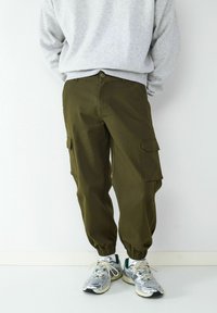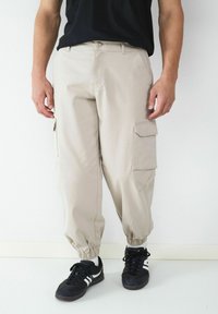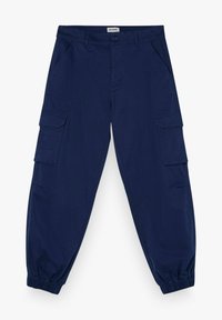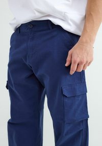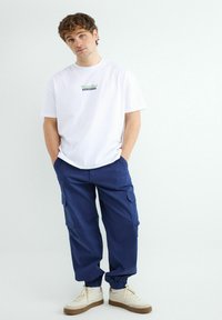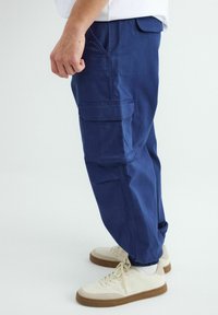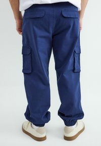 Homme portant un pantalon cargo bleu marine avec des poignets élastiques et des baskets blanches, debout devant un fond uni.