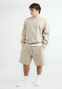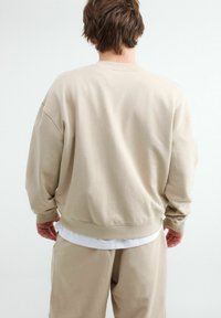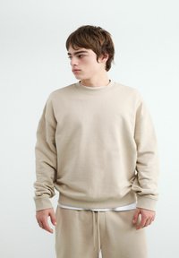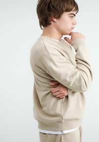 Jeune homme aux cheveux bruns portant un sweat beige et un pantalon de jogging assorti, regardant vers sa gauche sur un fond uni clair.