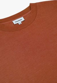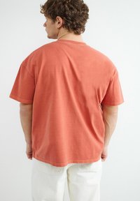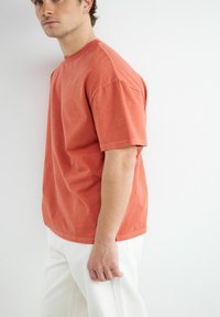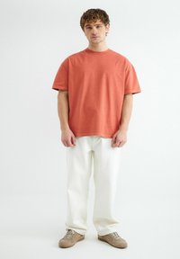 Jeune homme aux cheveux bruns bouclés portant un t-shirt orange ample et un pantalon blanc, debout contre un mur blanc uni.