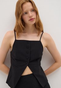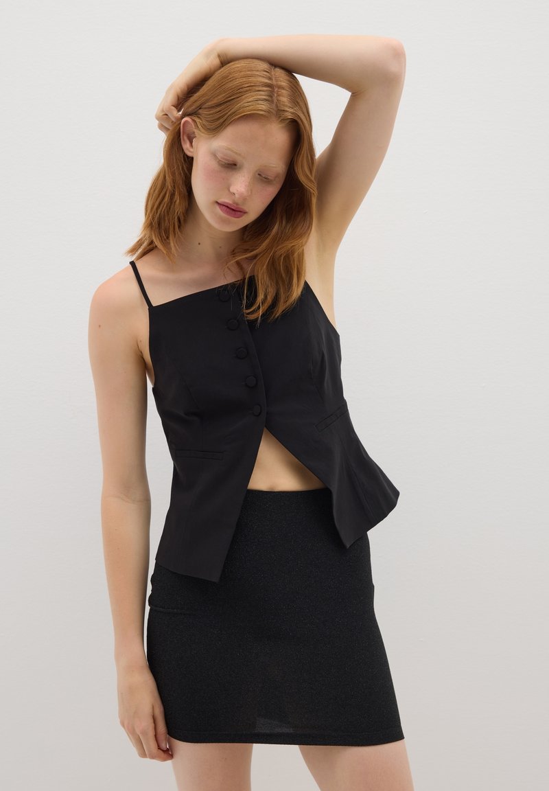 Le gilet noir de la ligne B.Angel est une pièce élégante et sophistiquée, parfaite pour rehausser votre style. Réalisé en mélange de viscose, il offre une coupe ajustée qui met en valeur la silhouette. La fermeture à boutons sur le devant ajoute une touche de classe, le rendant idéal pour compléter des tenues raffinées pendant la saison automne/hiver. Un élément distinctif qui ne peut manquer dans votre garde-robe pour des looks toujours à la mode.