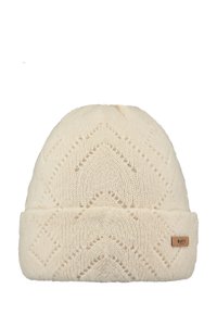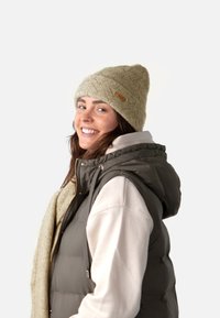 Bonnet en tricot beige avec un motif texturé, associé à une écharpe beige clair et un gilet sans manches matelassé vert olive, avec des accents argentés.