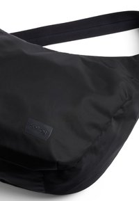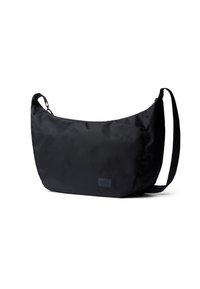 Sac bandoulière en nylon noir avec sangle ajustable et petite étiquette de marque rectangulaire sur le devant, sur fond blanc.