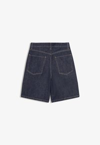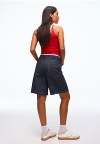 Personne portant un short en denim bleu foncé, un haut court rouge, des chaussettes blanches et des baskets beige, debout les mains dans les poches.
