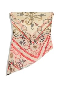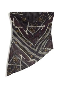Écharpe noire avec des rayures blanches, une chaîne dorée et des motifs de volant, ainsi qu'un motif ponctué formant un triangle central.