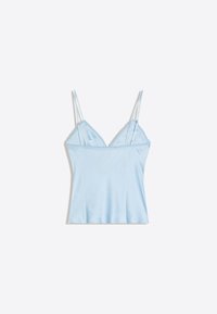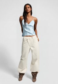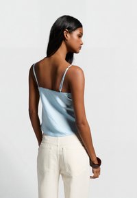 Femme aux longs cheveux foncés portant un caraco satiné bleu clair et un pantalon crème, accessoirisée avec des bracelets marron et blanc, sur un fond uni.