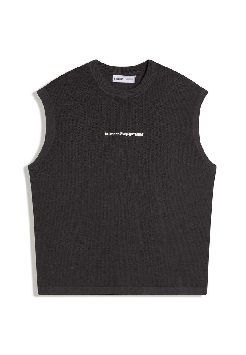 Haut sans manches en maille noir avec encolure ronde et texte blanc "lowsignal" centré sur le devant.