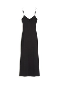 Femme portant une robe longue bleu clair, sans manches, cintrée, avec de fines bretelles et des sandales à talons noires ouvertes, debout devant un fond blanc.