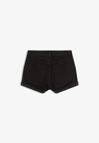 Jeune femme aux longs cheveux bruns portant un débardeur noir par-dessus une chemise blanche et un short noir, debout devant un fond blanc.