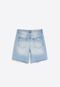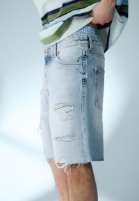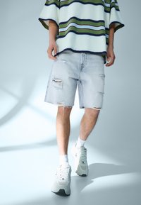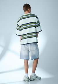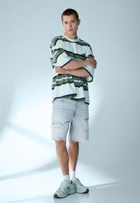 Jeune homme debout, les bras croisés, portant une chemise oversize rayée vert et blanc, un short en jean déchiré, des chaussettes blanches et des baskets.