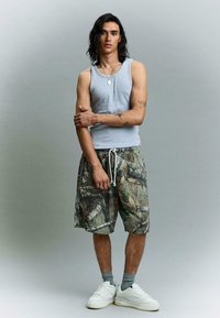Homme portant un short à motif camouflage avec cordon de serrage, chaussettes grises, baskets blanches et un débardeur gris, debout les mains dans les poches.