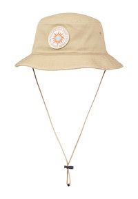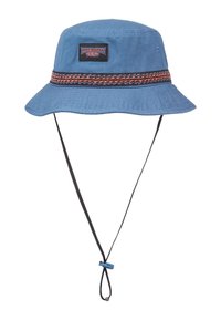 Un homme aux cheveux bouclés porte un chapeau seau noir avec un bandeau à motifs et un t-shirt teal avec un logo, regardant légèrement sur le côté.
