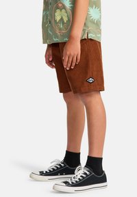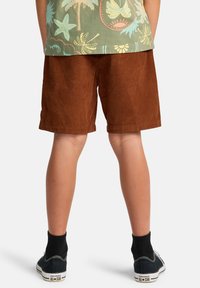 Shorts en velours côtelé marron avec une finition texturée, portés avec des baskets noires et des lacets blancs. Le haut est une chemise à motifs colorés.